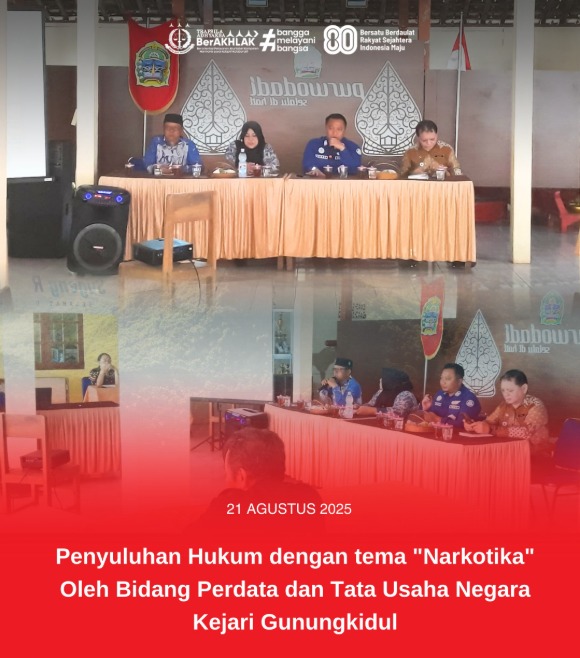 Tomy Novendri, S.H., M.Kn. Selaku Kepala Seksi Perdata dan Tata Usaha Negara bersama dengan Bagian Hukum Pemda Kabupaten Gunungkidul telah melaksanakan Kegiatan Penyuluhan Hukum dengan tema “Narkotika”, adapun kegiatan ini dilaksanakan dengan tujuan agar masyarakat sadar dan semakin memahami mengenai Narkotika sehingga dapat mencegah pemakaian dan peredaran Narkotika di lingkungan masyarakat.