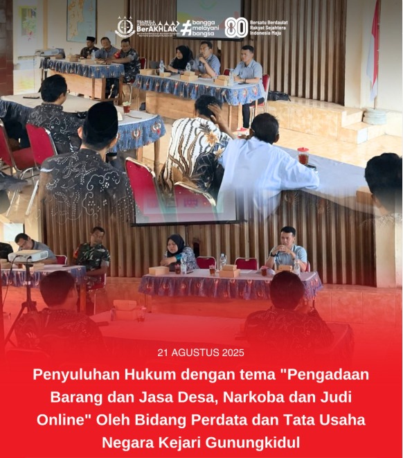 Surya Hermawan, S.H., M.H. Selaku Kepala Seksi Intelijen dan Heri Setiawan, S.H., M.H. Selaku Kepala Subseksi Perdata dan Tata Usaha Negara bersama dengan Bagian Hukum Pemda Kabupaten Gunungkidul telah melaksanakan Kegiatan Penyuluhan Hukum dengan tema “Pengadaan Barang dan Jasa Desa, Narkoba dan Judi Online”