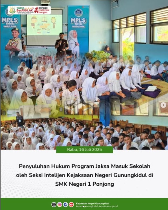 Pada hari Rabu, tanggal 16 Juli 2025 Seksi Intelijen Kejaksaan Negeri Gunungkidul melaksanakan kegiatan Penyuluhan Hukum Program Jaksa Masuk Sekolah (JMS) bertempat di SMK Negeri 1 Ponjong, alamat Jl. Wonosari-Baran Km. 20, Bedoyo, Kap. Ponjong, Kabupaten Gunungkidul. Bertindak sebagai narasumber, yakni Kasubsi Perdata dan TUN Kejaksaan Negeri Gunungkidul, Heri Setiawan, S.H., M.H.