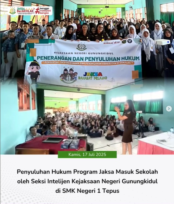 Pada hari Kamis, tanggal 17 Juli 2025 Seksi Intelijen Kejaksaan Negeri Gunungkidul melaksanakan kegiatan Penyuluhan Hukum Program Jaksa Masuk Sekolah (JMS) bertempat di SMK Negeri 1 Tepus. Bertindak sebagai narasumber, yakni Kasubsi Pertimbangan Hukum Kejaksaan Negeri Gunungkidul, Ni Made Sukreni Gadis Bali, S.H.