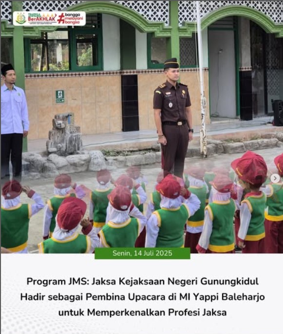 Pada hari Senin, 14 Juli 2025, Jaksa Kejaksaan Negeri Gunungkidul, Heri Setiawan, S.H., M.H., selaku Kasubsi Perdata dan Tata Usaha Negara (TUN) yang tergabung dalam Tim Penyuluhan Hukum Program Jaksa Masuk Sekolah (JMS), hadir sebagai pembina upacara di MI Yappi Baleharjo, Wonosari. Kegiatan ini dilaksanakan sebagai sarana untuk memperkenalkan profesi jaksa kepada para pelajar.