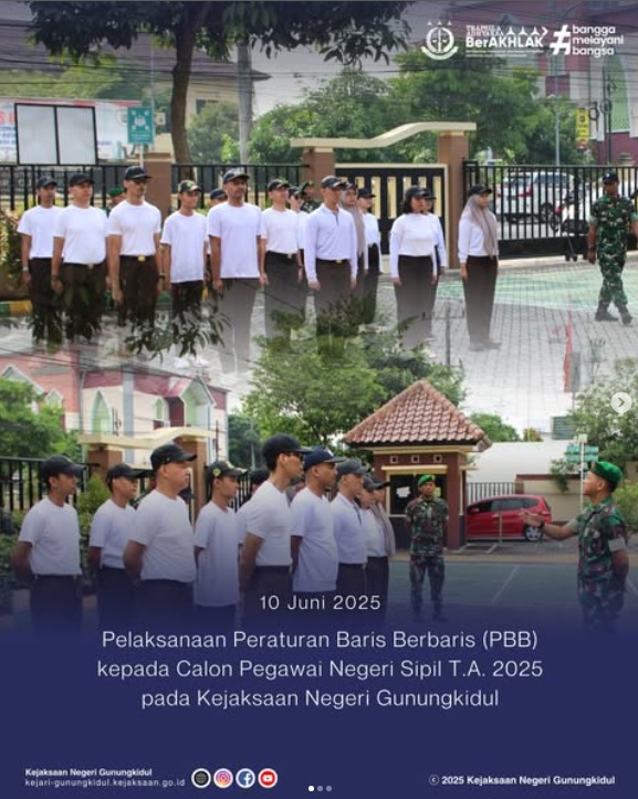 Pada hari Selasa, tanggal 10 Juni 2025 bertempat di halaman Kantor Kejaksaan Negeri Gunungkidul, telah dilaksanakan kegiatan Peraturan Baris Berbaris (PBB) kepada Calon Pegawai Negeri Sipil T.A. 2025 dengan peserta sebanyak 15 orang. Kegiatan PBB dibimbing langsung oleh personel Kodim 0730/Gunungkidul.
