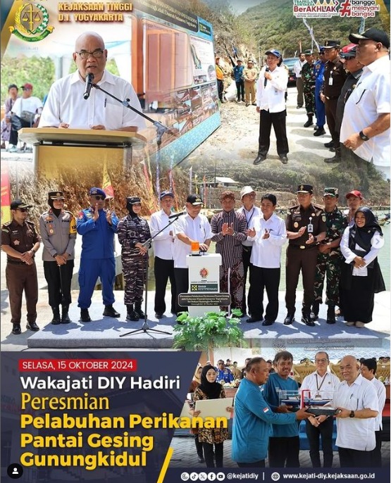 Wakil Kepala Kejaksaan Tinggi DIY Dr. Dwi Antoro, S.H., M.H. menghadiri Peresmian Pelabuhan Perikanan Pantai (PPP) Gesing, Selasa (22/10/2024). Peresmian dilakukan oleh Wakil Gubernur DIY, KGPAA Paku Alam X, di Teluk Gesing, Girikarto, Panggang, Gunungkidul, menjadikan PPP Gesing pelabuhan terbesar kedua di DIY setelah Sadeng.