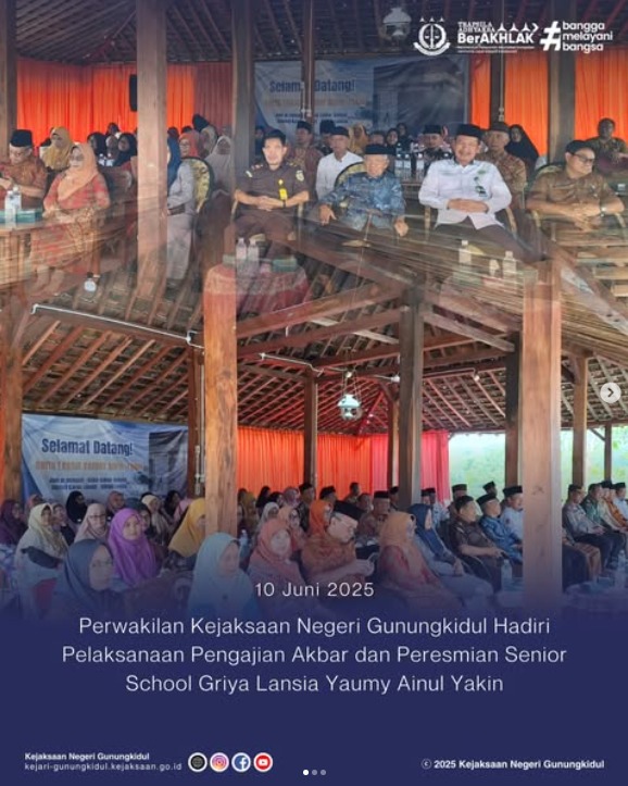 Perwakilan Kejaksaan Negeri Gunungkidul hadiri pelaksanaan Pengajian Akbar dan Peresmian Senior School Griya Lansia Yaumy Ainul Yakin pada hari Selasa (10/06/2025) bertempat di Dusun Singkar 1, Kalurahan Wareng, Kapanewon Wonosari, Kabupaten Gunungkidul.