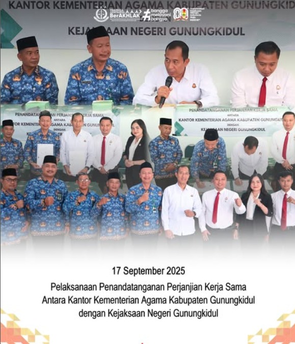 Pada hari ini Rabu, 17 September 2025 bertempat di Aula Kantor Kementerian Agama Gunungkidul, telah dilaksanakan Penandatanganan Perjanjian Kerjasama antara Kementerian Agama Gunungkidul dengan Kejaksaan Negeri Gunungkidul tentang Sinergi dan Koordinasi di Bidang Hukum. Kegiatan dihadiri oleh Kepala Kejaksaan Negeri Gunungkidul, Agung Sugiharto, S.Kom., S.H., M.H., dengan didampingi oleh Tomy Novendri, S.H., M.Kn. selaku Kepala Seksi Perdata dan TUN serta Kasubsi Pertimbangan hukum, dan Kasubsi Datun.