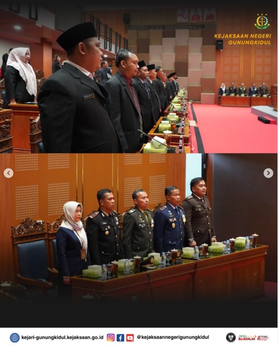 Perwakilan Kejaksaan Negeri Gunungkidul hadir dalam Rapat Paripurna DPRD Kab. Gunungkidul “Pengumuman Hasil Penetapan Pasangan Calon Bupati dan Wakil Bupati Terpilih Kabupaten Gunungkidul Tahun 2024 dan Pengumuman Akhir Masa Jabatan Bupati dan Wakil Bupati Periode 2021-2025”, bertempat di Ruang Rapat Handayani, Setda Kabupaten Gunungkidul pada Selasa (14/01/2025). Kegiatan dilaksanakan di Ruang Rapat Paripurna DPRD Kab. Gunungkidul.