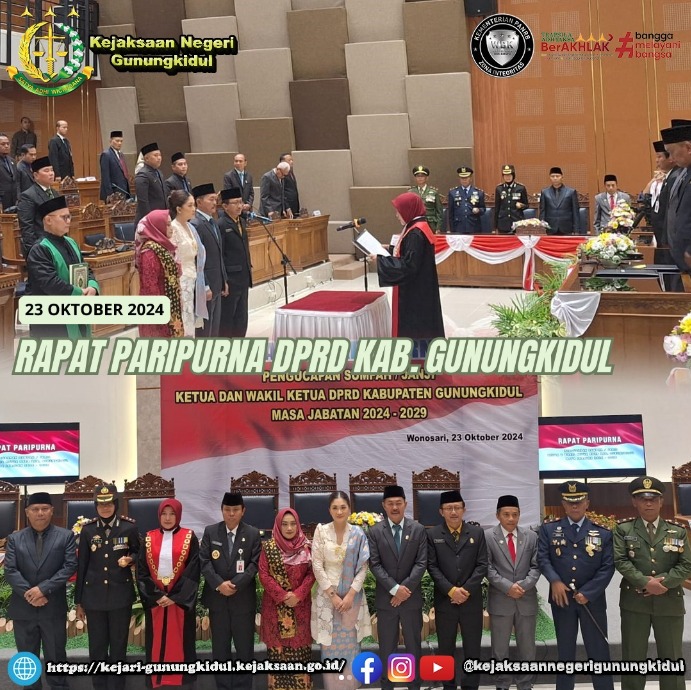 Pada hari Rabu 24 Oktober 2024 Kepala Kejaksaan Negeri Gunungkidul menghadiri Rapat Paripurna DPRD Kab. Gunungkidul “Pengucapan Sumpah/Janji Ketua & Wakil Ketua DPRD Kabupaten Gunungkidul Masa Jabatan 2024-2029.” di Ruang Rapal Paripurna DPRD Kabupaten Gunungkidul.