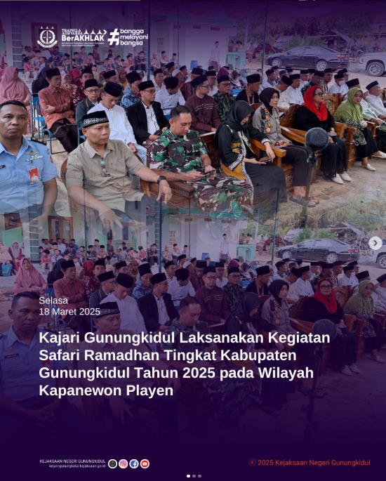 Kepala Kejaksaan Negeri Gunungkidul, Slamet Jaka Mulyana, S.H., M.H. bersama dengan jajaran Forkopimda Kabupaten Gunungkidul melaksanakan kegiatan Safari Ramadhan Tingkat Kabupaten Gunungkidul Tahun 2025 pada Wilayah Kapanewon Playen. Kegiatan bertempat di Masjid Al-Qomariah, Dusun Ngrancang, Kalurahan Bleberan, Kapanewon Playen pada hari Selasa (18/03/2025).