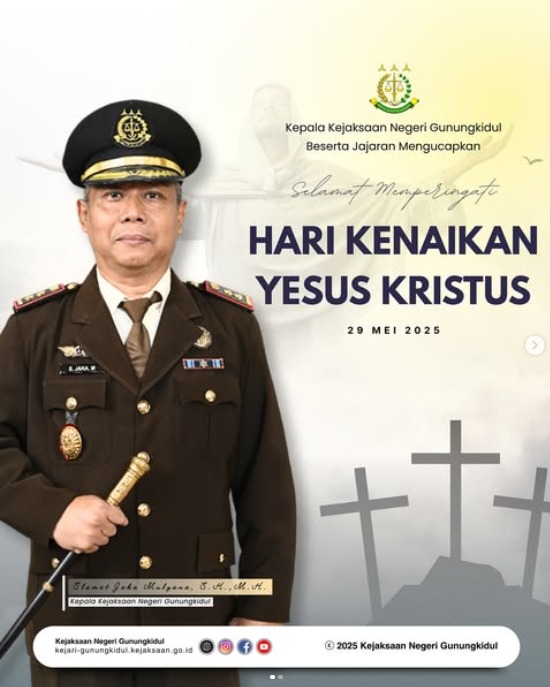 Kepala Kejaksaan Negeri Gunungkidul beserta Jajaran mengucapkan Selamat memperingati Hari Kenaikan Yesus Kristus bagi umat Kristiani.