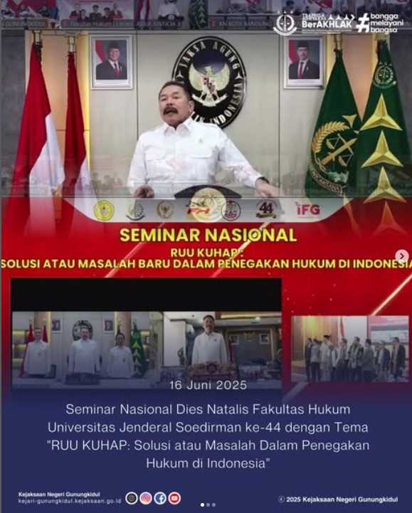 Kepala Kejaksaan Negeri Gunungkidul, Slamet Jaka Mulyana, S.H., M.H. didampingi oleh Kepala Seksi Tindak Pidana Umum dan Kepala Seksi Tindak Pidana Khusus hadir secara virtual dalam pelaksanaan Seminar Nasional Dies Natalis FH Universitas Jenderal Soedirman ke-44 dengan Tema “RUU KUHAP: Solusi atau Masalah Dalam Penegakan Hukum di Indonesia”.