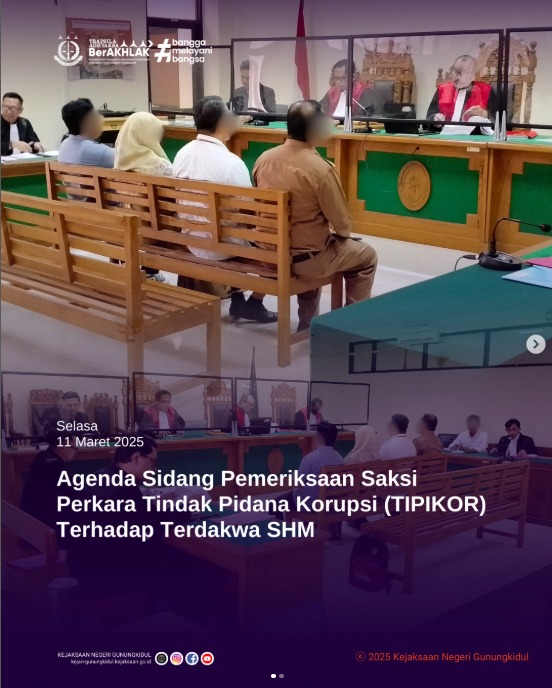 Pada hari Selasa, 11 Maret 2025 telah dilaksanakan Agenda Sidang Pemeriksaan Saksi Perkara TIPIKOR terhadap Terdakwa berinisial SHM. Sidang dilaksanakan di Pengadilan Tindak Pidana Korupsi dan Hubungan Industrial Yogyakarta, pada pukul 10.00 WIB.