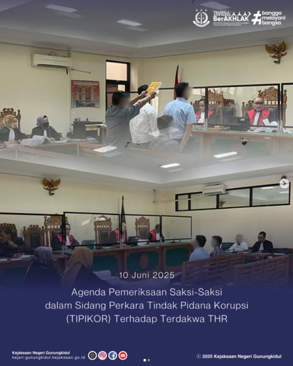 Pada hari Selasa, tanggal 10 Juni 2025 telah dilaksanakan Agenda Pemeriksaan Saksi-Saksi dalam Sidang Perkara Tindak Pidana Korupsi (TIPIKOR) terhadap Terdakwa THR. Agenda sidang bertempat di Pengadilan Tindak Pidana Korupsi dan Hubungan Industrial Yogyakarta.