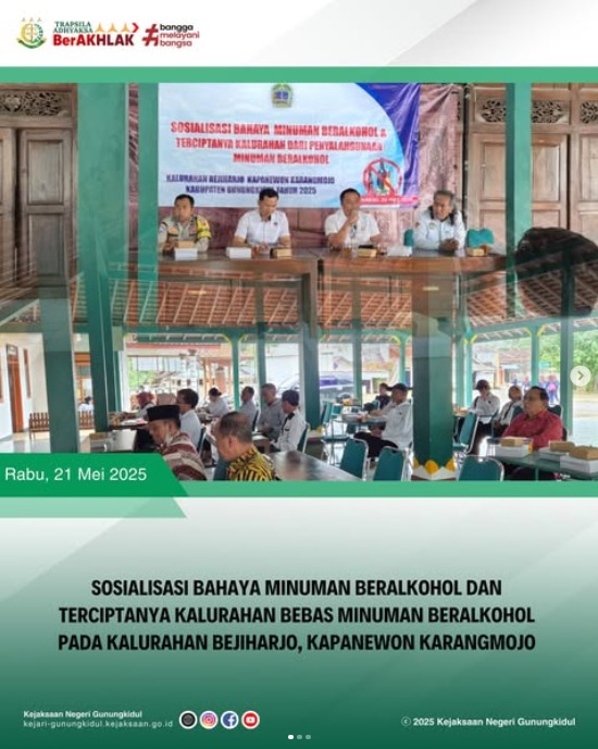 Kepala Seksi Perdata dan TUN Kejaksaan Negeri Gunungkidul, Tomy Novendri, S.H., M.Kn, hadir sebagai narasumber dalam kegiatan Sosialisasi Bahaya Minuman Beralkohol dan Terciptanya Kalurahan Bebas Minuman Beralkohol pada Kalurahan Bejiharjo, Kapanewon Karangmojo pada Rabu, 21 Mei 2025.