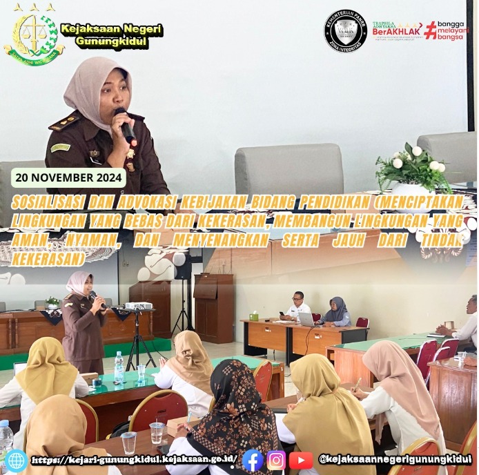 Kasi Pidum Kejaksaan Negeri Gunungkidul Nuraisya Rachmaratri, S.H.,M.H hadir sebagai Narasumber pada kegiatan Sosialisasi dan Advokasi Kebijakan Bidang Pendidikan (Menciptakan Lingkungan yang Bebas dari Kekerasan, Membangun Lingkungan Yang Aman, Nyaman, dan Menyenangkan serta Jauh dari Tindak Kekerasan), di Ruang Sasana Krida Wiyata Dinas Pendidikan Kab. Gunungkidul. Rabu(20/11/2024)