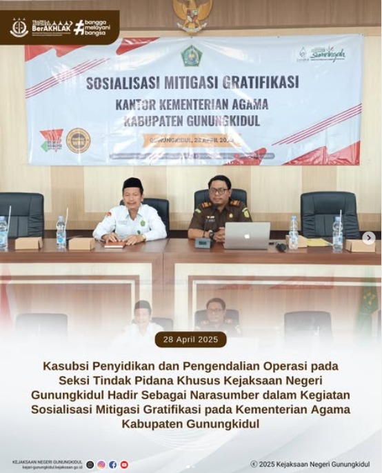 Senin, 28 April 2025 Kasubsi Penyidikan dan Pengendalian Operasi pada Seksi Tindak Pidana Khusus Kejaksaan Negeri Gunungkidul, Johan Satya Adhyaksa, S.H., M.H., hadir sebagai Narasumber dalam Kegiatan Sosialisasi Mitigasi Gratifikasi bertempat di Kantor Kementerian Agama Kabupaten Gunungkidul.