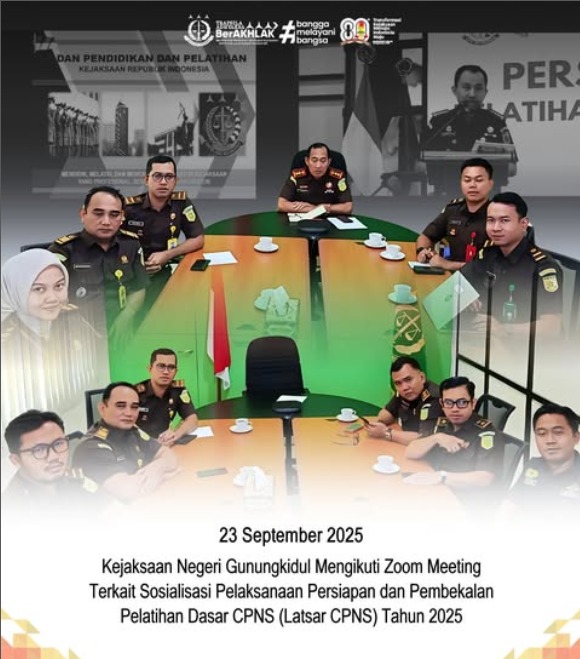 Pada hari Selasa, tanggal 23 September 2025 bertempat di Ruang Rapat Kejaksaan Negeri Gunungkidul, telah dilaksanakan kegiatan Zoom Meeting terkait Sosialisasi Pelaksanaan Persiapan dan Pembekalan Pelatihan Dasar CPNS (Latsar CPNS) Tahun 2025. Adapun tujuan dilaksanakannya kegiatan ini yakni untuk mengkoordinasi pelaksanaan Penyelenggarahan Pelatihan Latsar CPNS 2025.