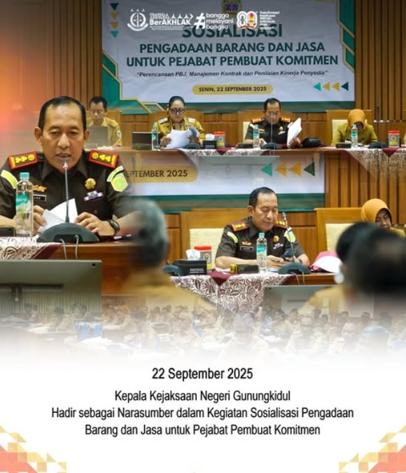Pada hari Senin, tanggal 22 September 2025, Kepala Kejaksaan Negeri Gunungkidul, Bapak Agung Sugiharto, S.Kom., S.H., telah hadir sebagai narasumber dalam acara “Sosialisasi Pengadaan Barang dan Jasa untuk Pejabat Pembuat Komitmen”. Acara ini diselenggarakan oleh Sekretariat Daerah Pemerintah Kabupaten Gunungkidul.