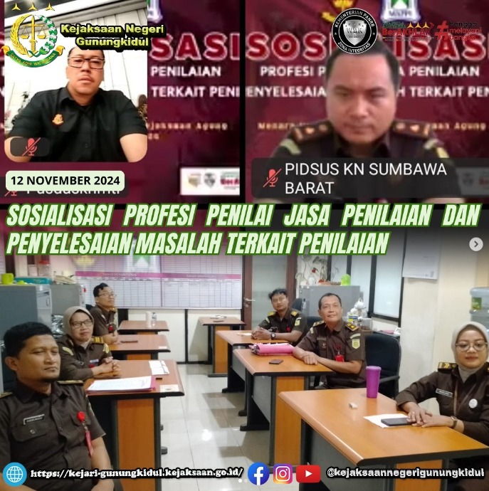 Bidang Pidana Khusus Kejaksaan Negeri Gunungkidul mengikuti secara virtual sosialisasi profesi penilai jasa penilaian dan penyelesaian masalah terkait penilaian, di Kantor Kejaksaan Negeri Gunungkidul. Selasa(12/11/2024)