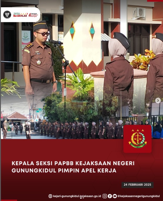 Senin, 14 April 2025 Kejaksaan Negeri Gunungkidul melaksanakan apel kerja rutin. Apel dipimpin oleh Kepala Seksi Tindak Pidana Umum Kejaksaan Negeri Gunungkidul,