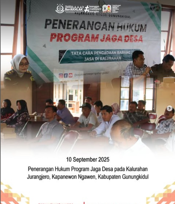 Pada hari Rabu, 10 September 2025, Seksi Intelijen Kejaksaan Negeri Gunungkidul menyelenggarakan kegiatan Penerangan Hukum dalam rangka Program Jaga Desa, yang bertempat di Balai Kalurahan Jurangjero, Kapanewon Ngawen, Kabupaten Gunungkidul.