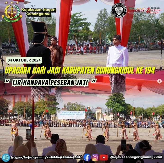 Kepala Kejaksaan Negeri Gunungkidul Slamet Jaka Mulyana, S.H.,M.H. menghadiri Upacara dalam rangka hari jadi Kabupaten Gunungkidul ke-194 di alun alun Pemda Gunungkidul, dengan Inspektur upacara PLT. Bupati Gunungkidul Heri Susanto, S.Kom.M.Si. Jum’at(4/10/2024)