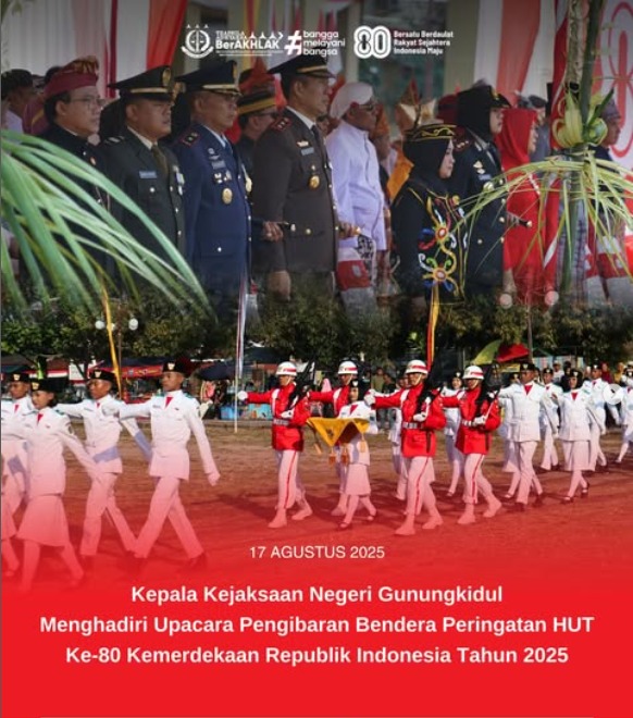 Kepala Kejaksaan Negeri Gunungkidul, Agung Sugiharto, S.Kom., S.H. didampingi Ketua IAD Daerah Gunungkidul, Ny. Endah D. Agung, menghadiri Upacara Pengibaran Bendera Peringatan HUT Ke-80 Kemerdekaan Republik Indonesia Tahun 2025, bertempat di Alun-Alun Wonosari pada Minggu (17/08/2025).
