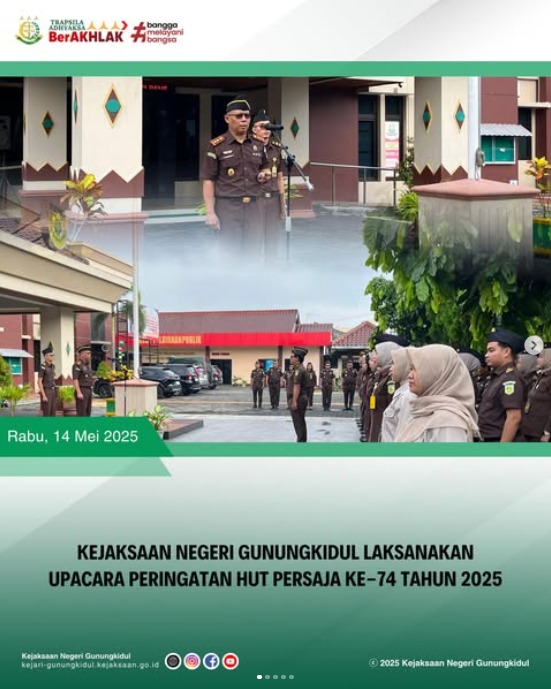 Pada hari Rabu, tanggal 14 Mei 2025 Kepala Kejaksaan Negeri Gunungkidul, Slamet Jaka Mulyana, S.H., M.H., memimpin pelaksanaan Upacara Peringatan Hari Ulang Tahun (HUT) Ke-74 Persatuan Jaksa Indonesia (PERSAJA) Tahun 2025 yang dilaksanakan di halaman kantor Kejari Gunungkidul.