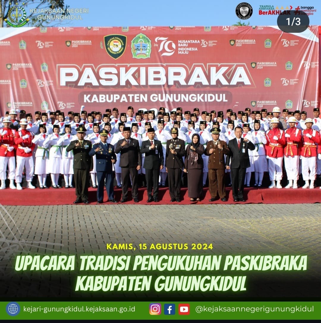 Kamis, 15 Agustus 2024 Kepala Kejaksaan Negeri Gunungkidul Menghadiri Acara Upacara Tradisi Pengukuhan Paskibraka Kabupaten Gunungkidul pada Pendopo Taman Budaya Gunungkidul.