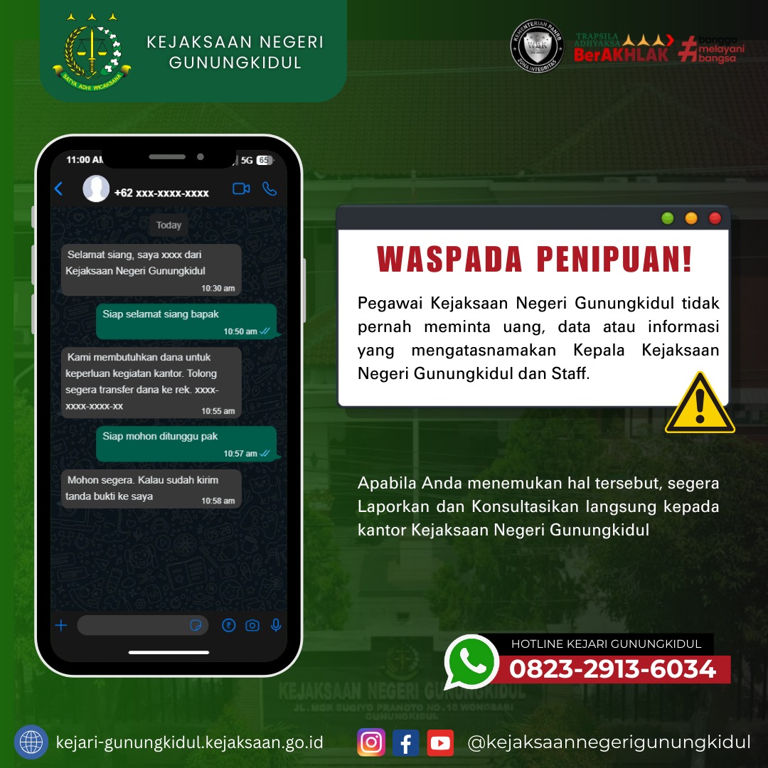 Waspada penipuan oleh pihak tidak bertanggung jawab yang mengatasnamakan Kejaksaan Negeri Gunungkidul!