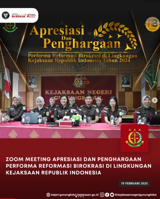 Kasubag Pembinaan Kejaksaan Negeri Gunungkidul dengan didampingi oleh perwakilan staf masing-masing bidang mengikuti zoom meeting Apresiasi dan Penghargaan Performa Reformasi Birokrasi di Lingkungan Kejaksaan Republik Indonesia. Kegiatan dilaksanakan pada hari Rabu, 19 Februari 2025 bertempat di Aula Kejaksaan Negeri Gunungkidul.