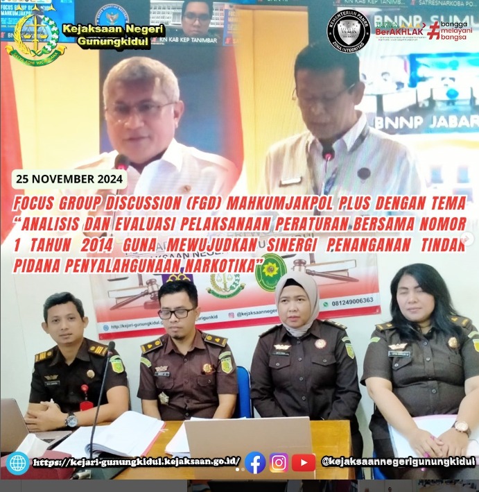 Kasi PB3R Kejari Gunungkidul bersama Jaksa Fungsional Kejari Gunungkidul mengikuti secara daring melalui Zoom Meeting Focus Group Discussion (FGD) MAHKUMJAKPOL PLUS dengan tema “Analisis dan Evaluasi Pelaksanaan Peraturan Bersama Nomor 1 Tahun 2014 Guna Mewujudkan Sinergi Penanganan Tindak Pidana Penyalahgunaan Narkotika” , dikantor Kejari Gunungkidul. Senin(25/11/2024)